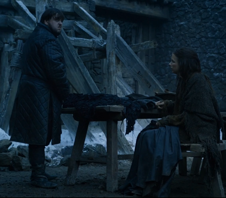 Gilly is worried about Sir Alister not letting Gilly and Baby Sam stay if Alliser Thorne becomes the new Lord Commander. Luckily, they talk about a supposedly good guy, Denys Mallister, who is also running. Hopefully we see him soon. Sam seems to have backed himself into a corner with that whole “never gonna leave you Gilly” speech from last season. Sure it was sweet, but I’m not sure he really thought it through.
