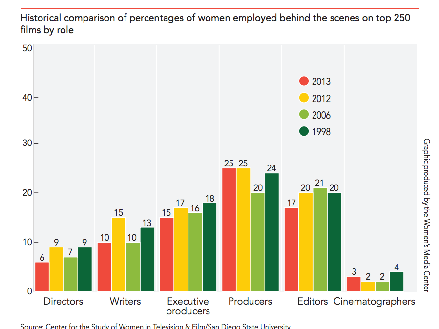 In movies, you might think that they are getting better, due to the rise of female-driven movies like The Hunger Games and The Heat. Sorry, but you would be wrong. Out of the top 100 movies this year only two had female directors. They were the remake of Carrie and the Disney animated movie Frozen. That means that the 98 other movies were directed by only dudes, and did I mention that Frozen was directed by two people and the other director was male. There might be a small problem in this.
