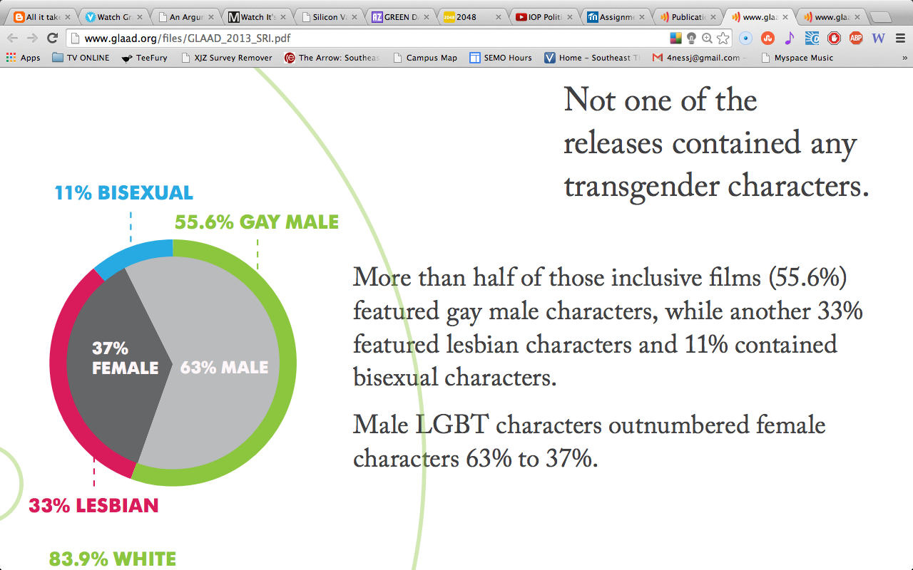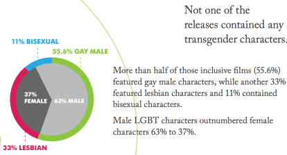 When we get into major motion pictures, the representation is worse. According to GLAAD, the nation’s leading LGBT media advocacy organization, only 14 out of the 101 films released by the major studios in 2012 even had a gay, lesbian, or bisexual character. There was also no films that had transgender characters.
